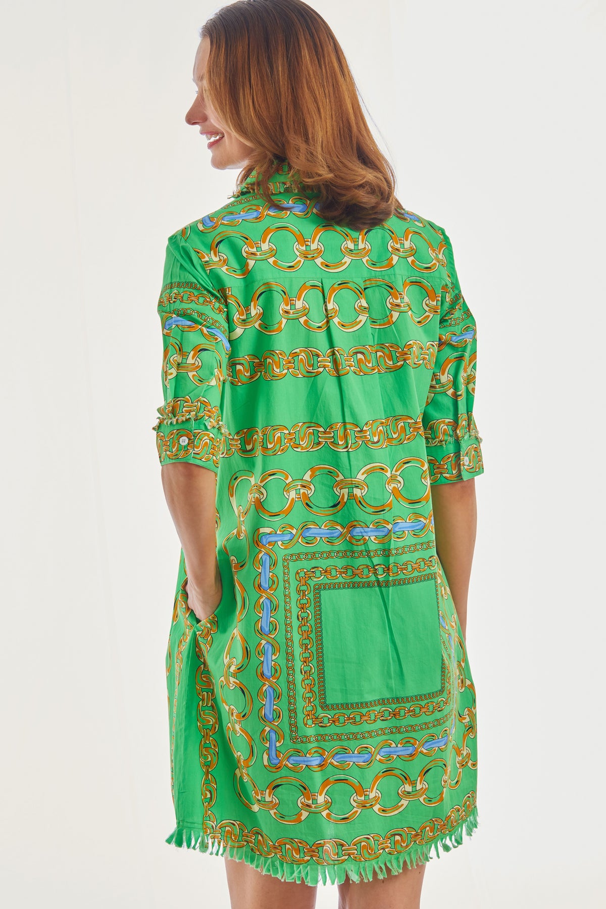 Introducing our Chatham Dress Green Blue Link Print, a stunning example of elegance in Dress design. Made from cotton spandex, it offers a comfortable and flattering fit. This piece is a must-have for those who value both style and comfort.