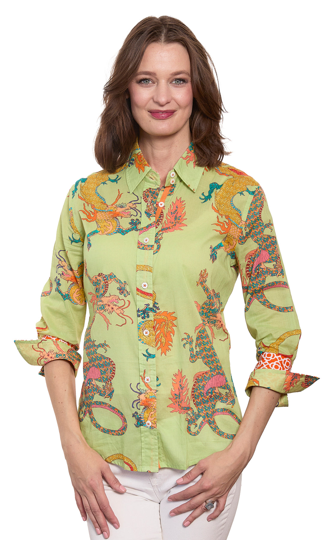 3/4 Sleeve Rome Shirt Soft Green Cotton Voile Dragon Print