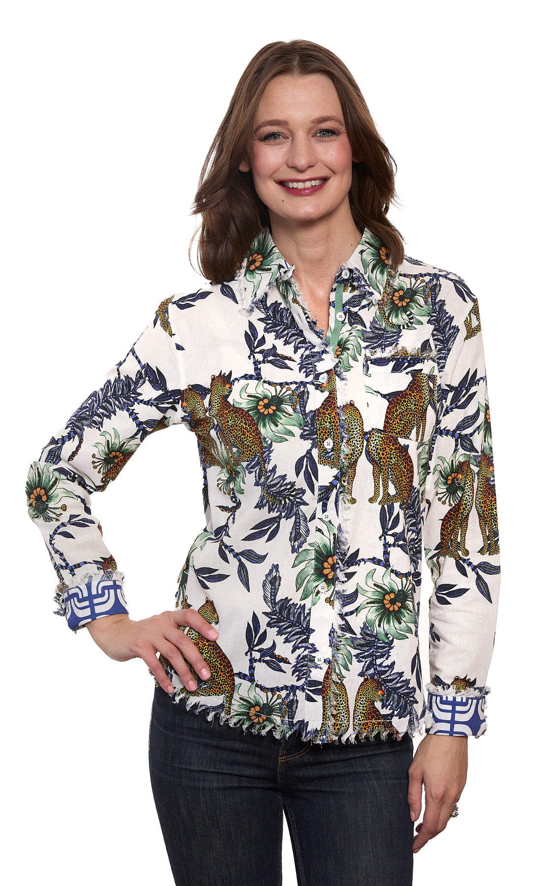 A masterfully designed Cape Cod Top that marries animal print audacity with botanical grace. Set against an ivory canvas, cheetah spots and floral accents create visual intrigue while the cotton-linen blend provides effortless comfort and durability.