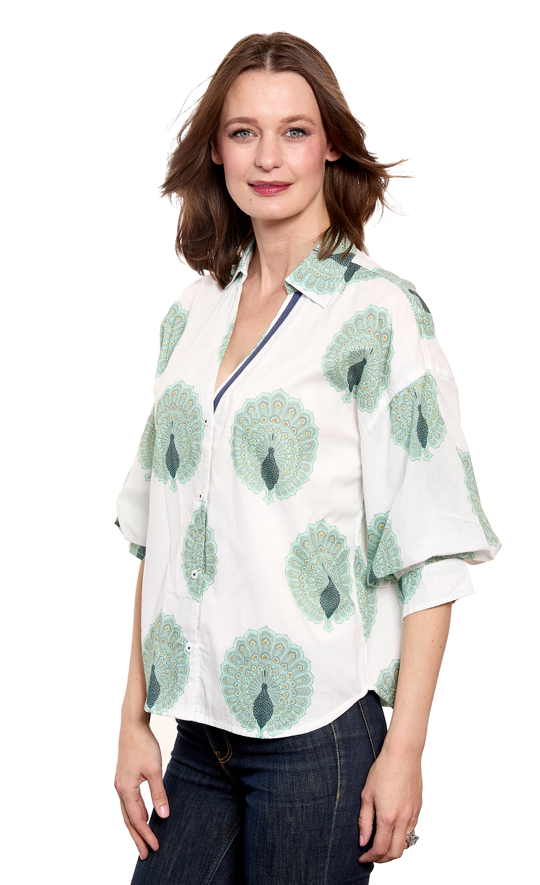 The Milano Puff Sleeve Top exemplifies refined simplicity with its delicate peacock print in soft green set against a pristine ivory canvas. Constructed from lightweight cotton voile, this piece offers both visual interest and exceptional wearability. The softly gathered puff sleeves create an effortlessly elegant proportion, while the breathable fabric makes it ideal for layering or wearing as a standalone statement.
